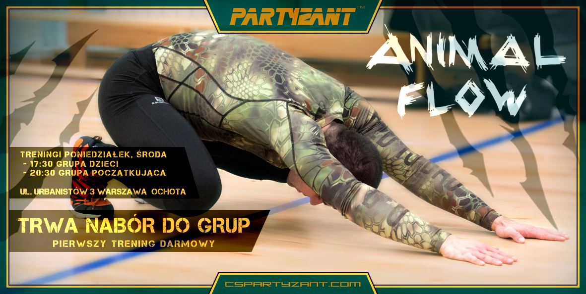 Wprowadzamy nowy zakres treningów jako uzupełnienie codziennej rutyny treningowej – Animal Flow. W Animal Flow zyskujemy świadomość własnego ciała, orientacji przestrzennej, koordynacji, jak również pracujemy ze swoim systemem nerwowo-mięśniowym, dzięki czemu po prostu poruszamy się lepiej i czujemy się lepiej. Co może przekładać się na wyniki w systemie walki.